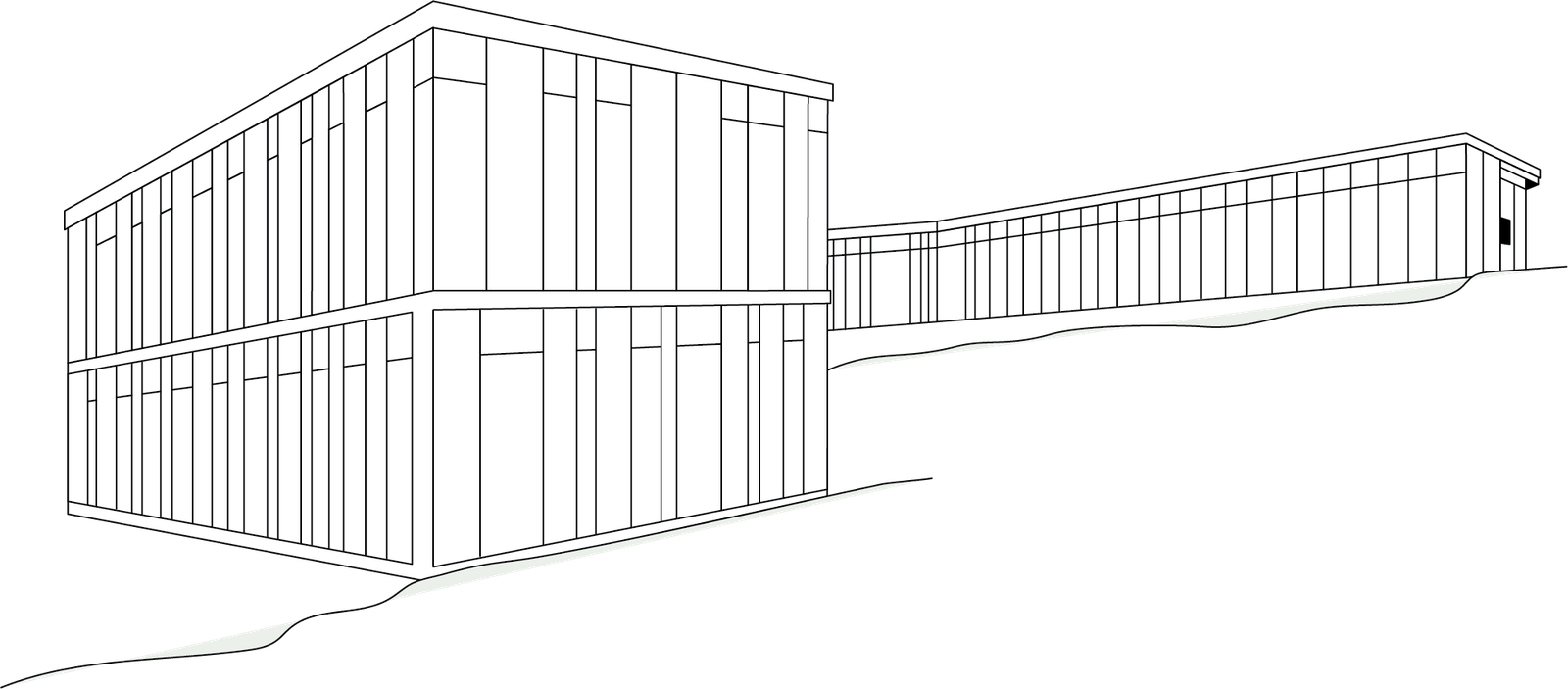 The buildings take advantage of the natural slope of the terrain towards a ravine to blend in with the environment and go unnoticed, relying on the use of a green roof. The location of existing trees is respected by placing both buildings in such a way that they form a courtyard resembling a cloister around which all circulation is established on the ground floor.
