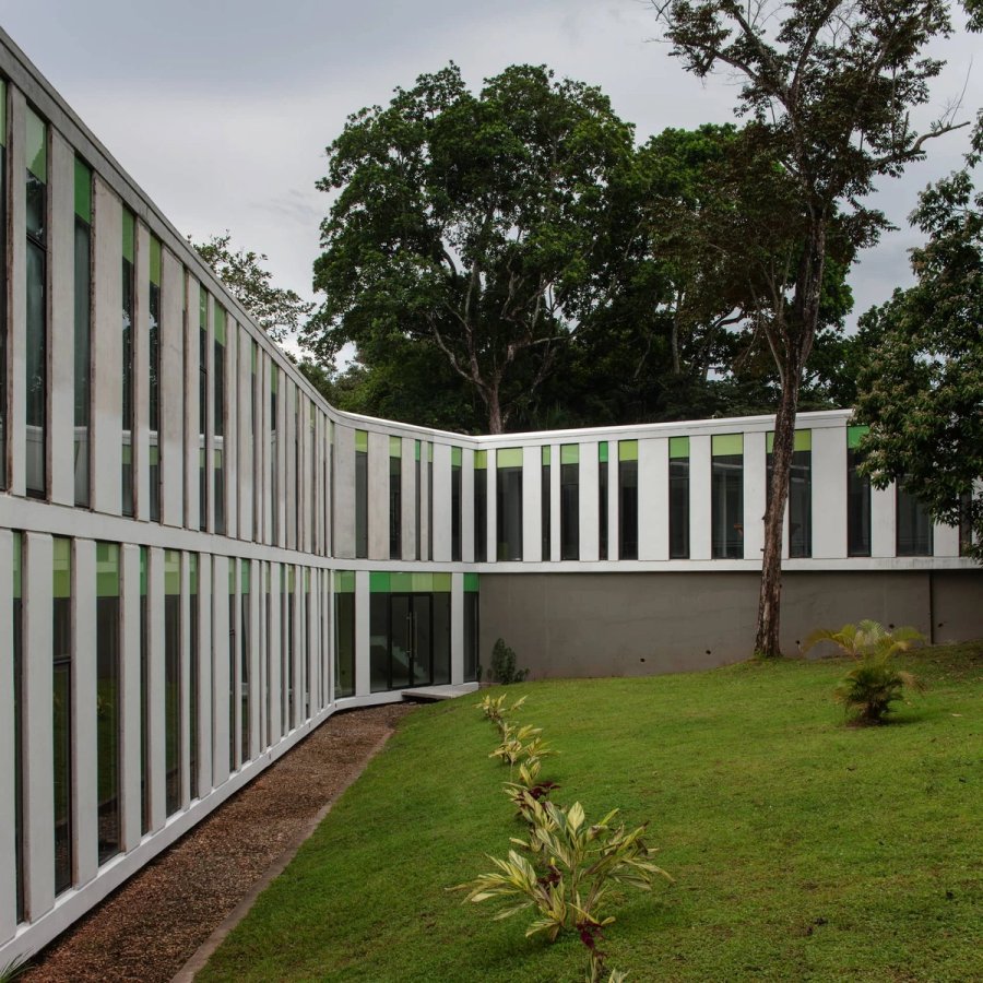 The building envelope is made using a prefabricated modular concrete system, forming a sequence of solids and voids that frame views of the surrounding landscape, creating in turn a series of shadows that filter the interior ambiance.