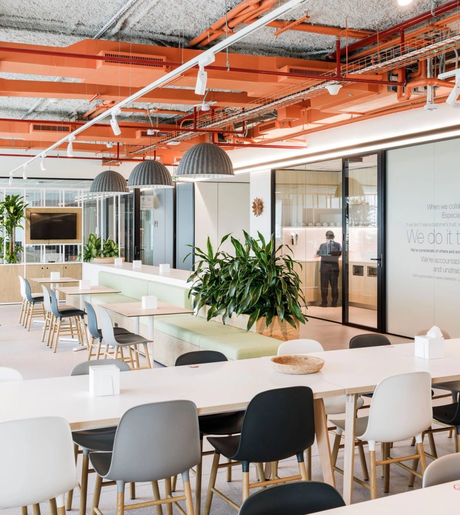 A key element for the 'look and feel' is the ceiling, as a white expanded mesh was chosen, and on it, an orange x-ray of all the equipment and systems that make the space function can be glimpsed, all in the brand's orange identity tone.