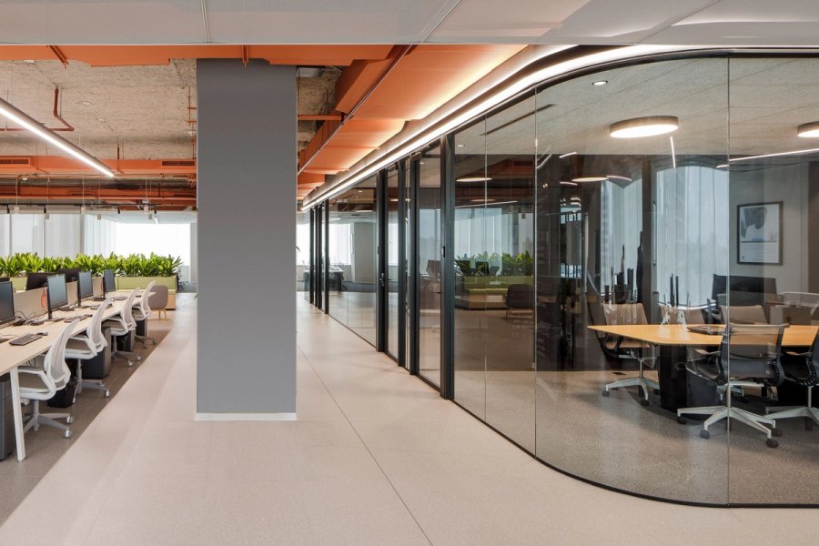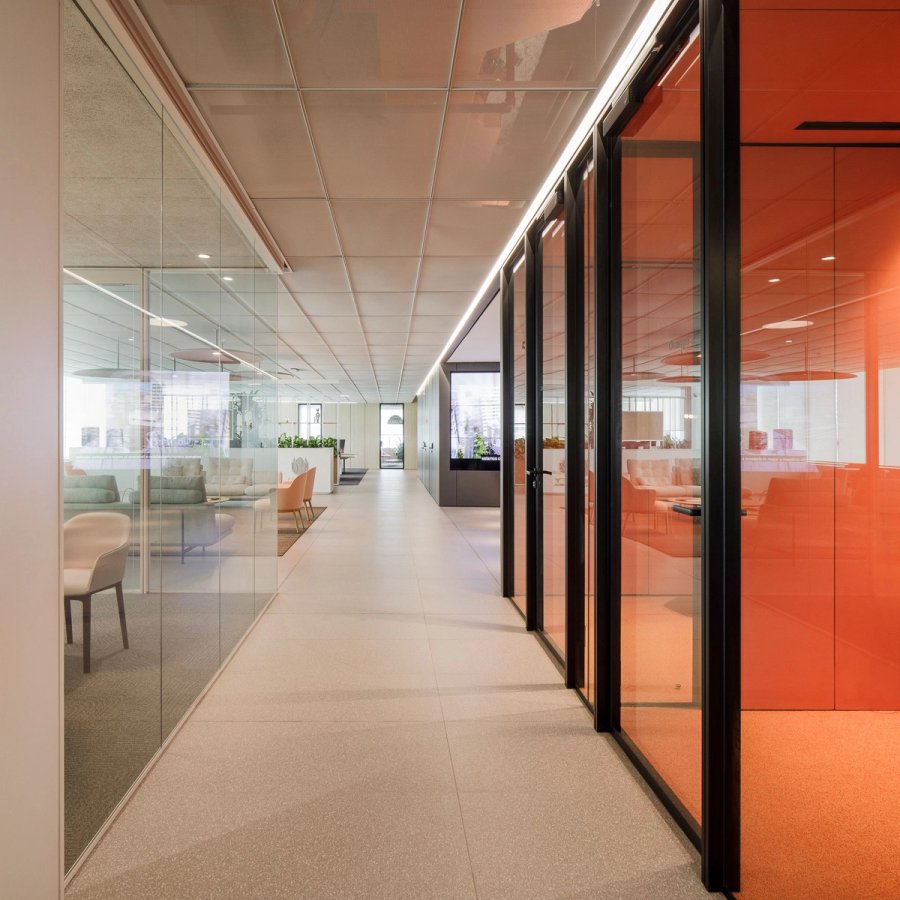 To achieve this, we implemented strong colors typical of Liberty's corporate identity, such as orange and dark gray, which are seen in furniture, carpets, and walls, balanced with light oak wood elements that inject warmth into the spaces.